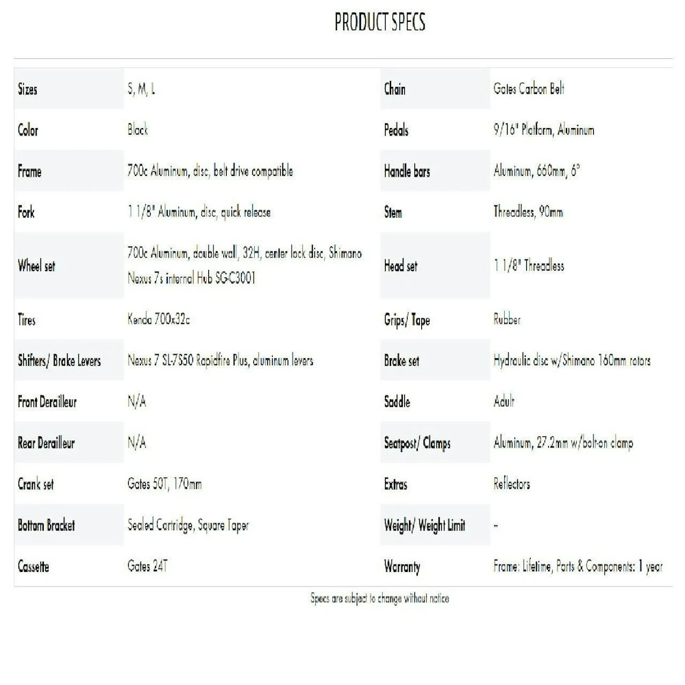 Frame/Fork: Aluminum frame and fork Tires/Wheels: Kenda 700x32c, aluminum double wall wheels Drivetrain: Shimano Nexus 7 speed, Gates Carbon Drive Brakes: Mechanical disc Belt drive, internally geared hub urban machine KEY FEATURES
